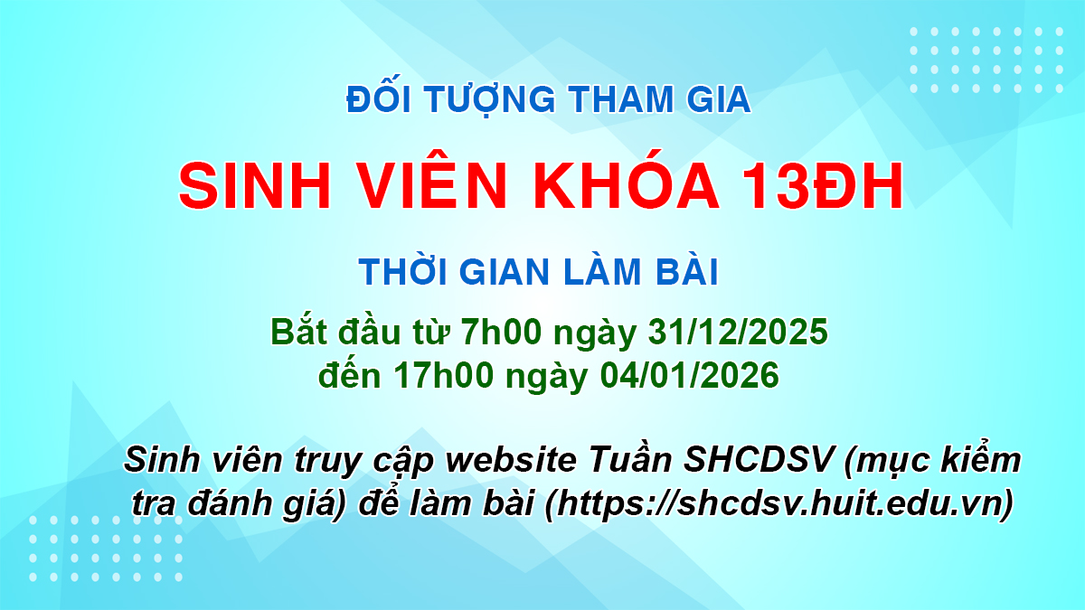 30/12/2025 - Lượt xem: 2989Căn cứ tiến độ đào tạo và tình hình triển khai Tuần Sinh hoạt công dân - Sinh viên năm học 2025-2026; Nhà trường thông báo về việc triển khai làm bài kiểm tra thu hoạch kết thúc Tuần sinh hoạt công dân sinh viên cuối khóa năm học 2025-2026 (định kỳ) đối với sinh viên Khóa 13ĐH như sau: